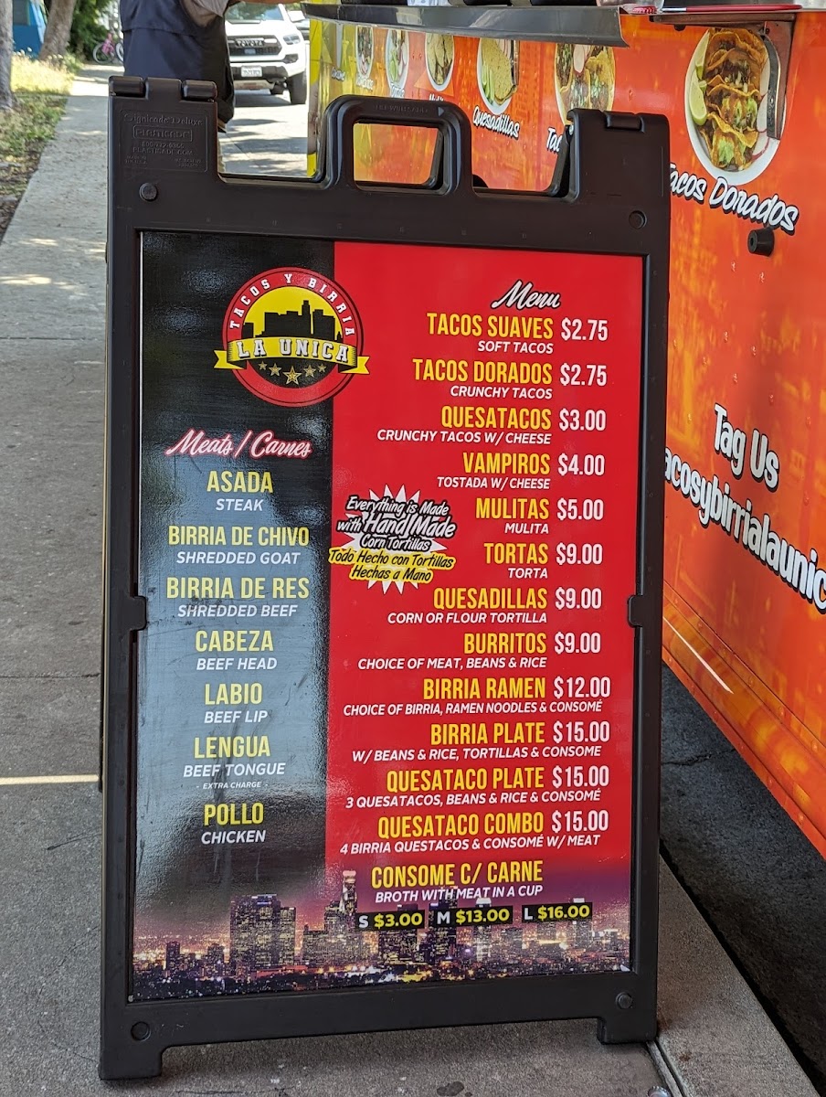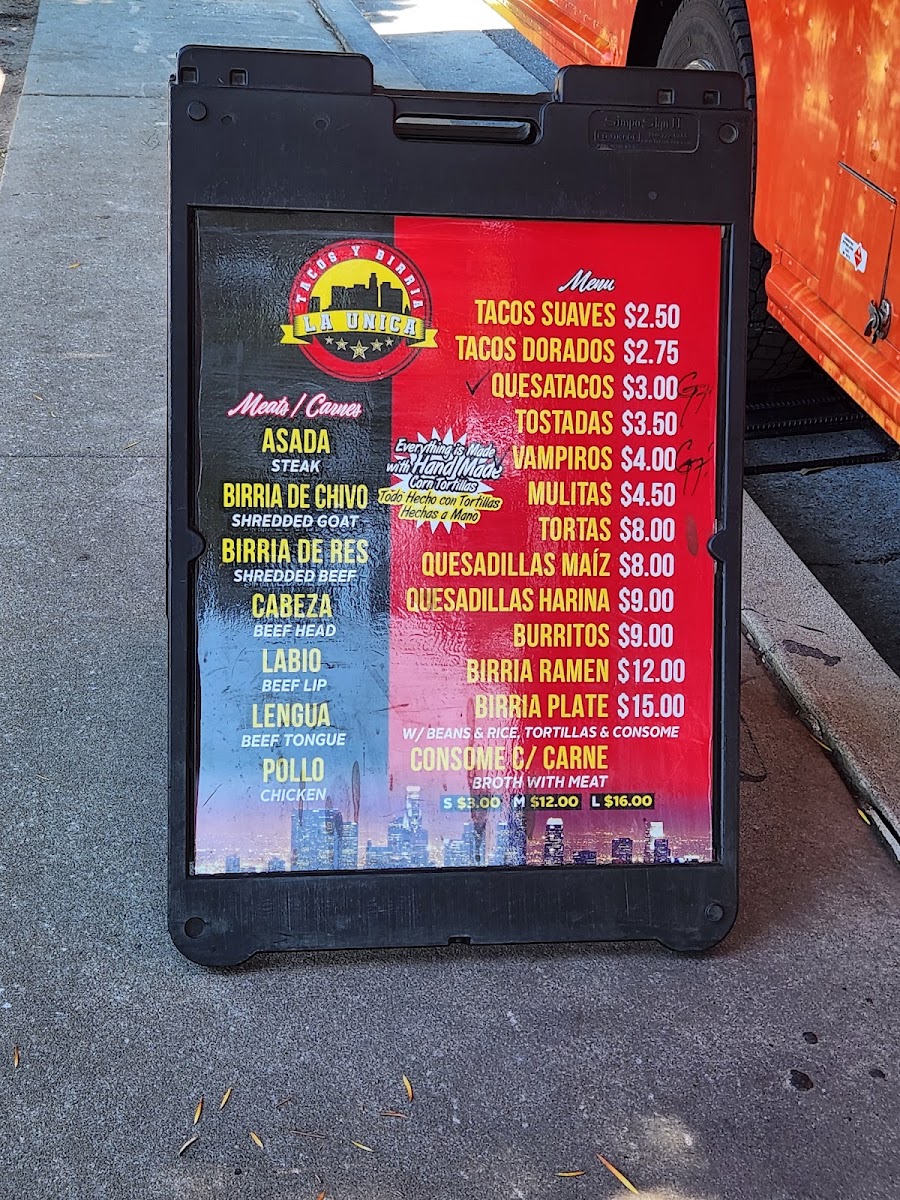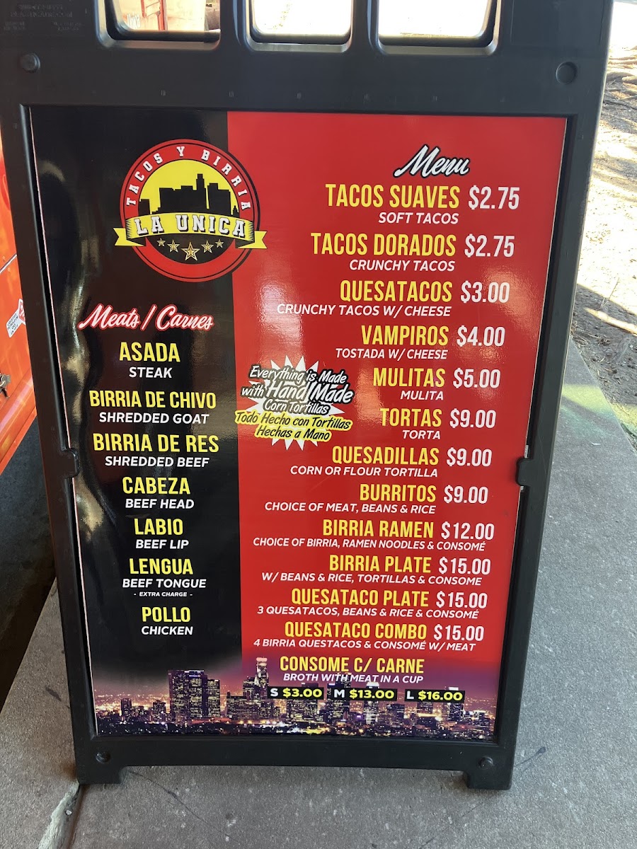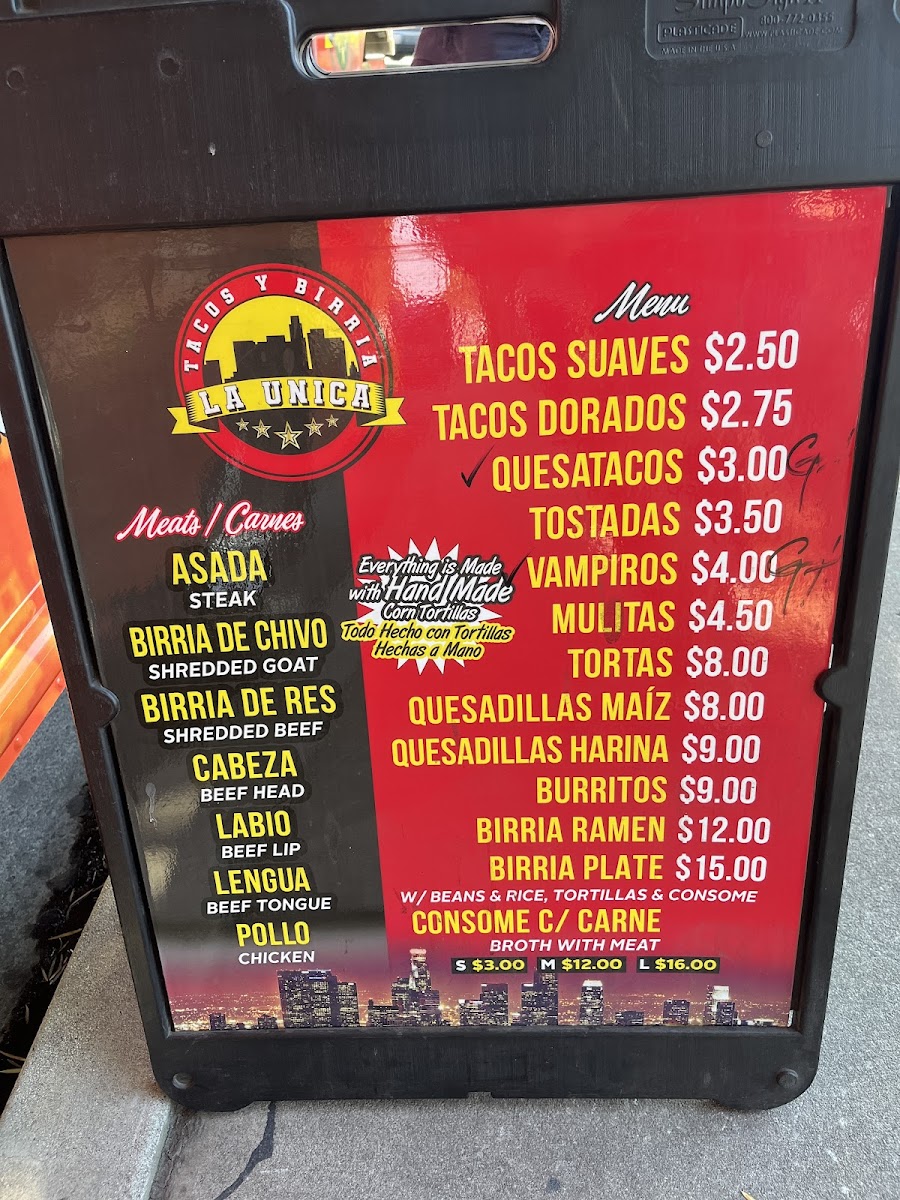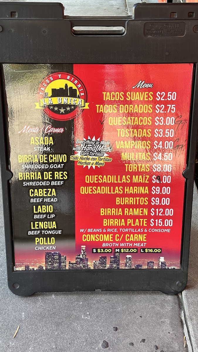 The menu at Tacos Y Birria La Unica - Mid City offers a delightful variety of Mexican dishes, perfect for any craving. For those seeking a classic taste, the Quesadillas De Harina (Flour Quesadillas) and Quesadillas De Maíz (Corn Quesadillas) are flavorful choices, while the Tacos Dorados (Crunchy Tacos) offer a crispy texture with every bite. For a twist on the traditional taco, the TortasQuesatacos (Crunchy Tacos W Cheese) provide a cheesy and satisfying option. To enhance your meal, there are several sides and extras, including Sour Cream (Crema), Red Sauce (Salsa Roja De Arbol), Chili Oil (Salsa De Aciete), Guacamole, and the spicy Habanero Sauce (Salsa De Habanero), all ready to add bold flavors to your dish. For a refreshing drink, the restaurant serves a selection of Aguas Frescas in a bottle, such as Jamaica, Lemonade with Chia, and Horchata, alongside a variety of sodas, including Coke, Coke Zero, Sprite, Squirt, and Mexican favorites like Mexican Coke Medio Litro, Jarritos, and Topo Chico Mineral Water. Whether you're in the mood for tacos, quesadillas, or a cold beverage, Tacos Y Birria La Unica offers an enjoyable, flavorful experience.